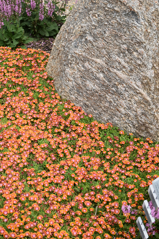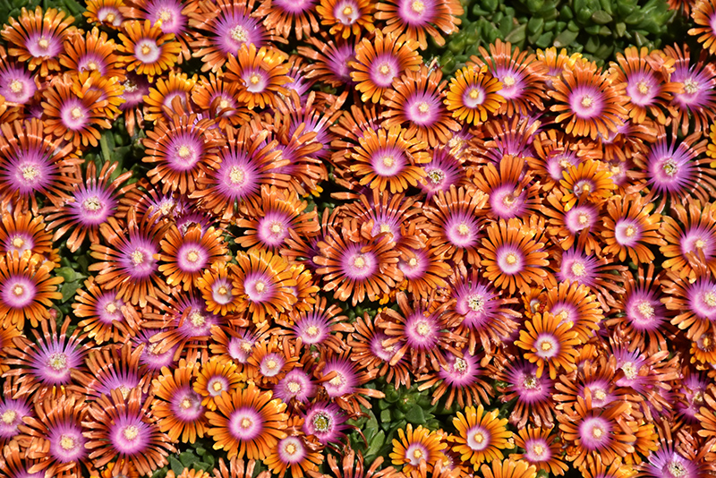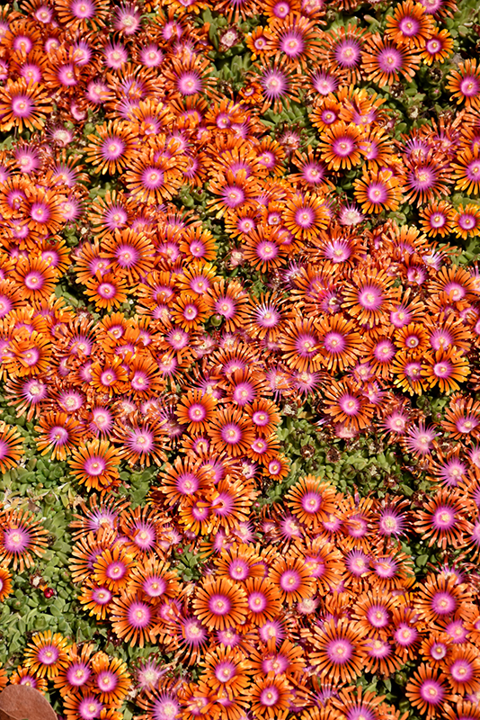 Low growing carpet-like, succulent, native to South Africa but amazingly hardy in North America; dazzling orange-red daisy-like flowers with a bright purple ring; perfect for xeriscapes, rock gardens, screes and sandy soils