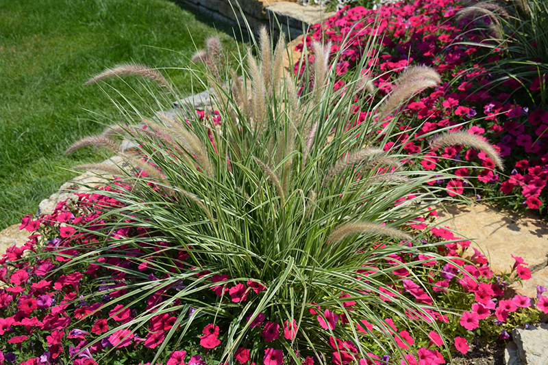 This highly ornamental grass is na excellent counterpart to the showy red-leaf varieties; features grassy green foliage with prominent white stripes, followed by fluffy flower heads in fall that last into winter; excellent for containers