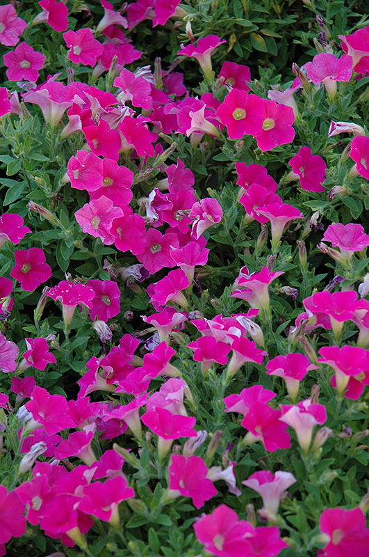 Shock Wave® Rose Petunia is clothed in stunning rose trumpet-shaped flowers with white throats at the ends of the stems from mid spring to late summer. Its pointy leaves remain green in color throughout the season.