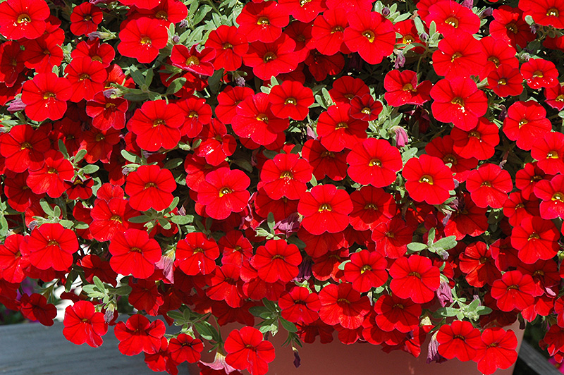 Cabaret® Bright Red Calibrachoa is covered in stunning crimson trumpet-shaped flowers with yellow throats at the ends of the stems from late spring to early fall. Its small pointy leaves remain green in color throughout the season.