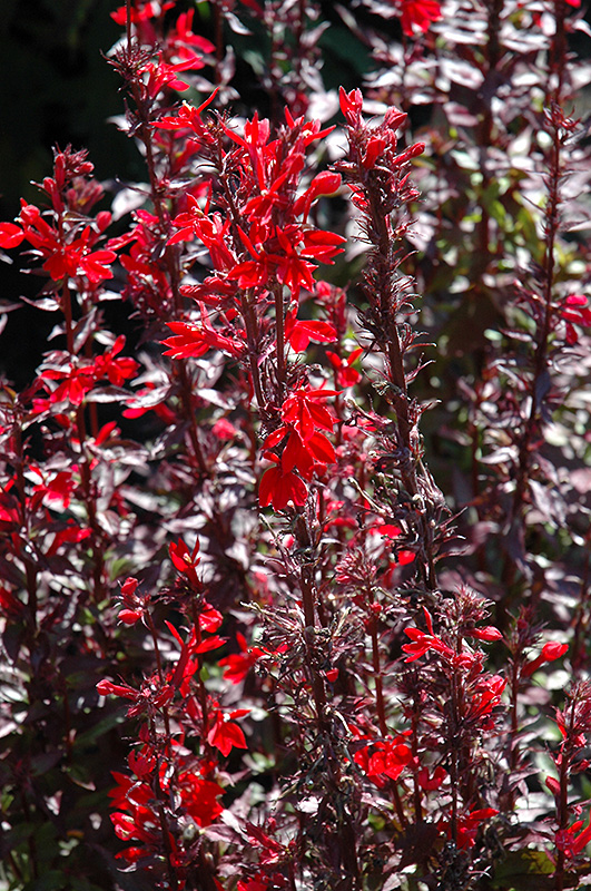 Fan Scarlet Cardinal Flower features showy spikes of scarlet tubular flowers rising above the foliage from early to mid summer, which emerge from distinctive dark red flower buds. The flowers are excellent for cutting. Its serrated pointy leaves remain green in color with showy brick red variegation throughout the season.