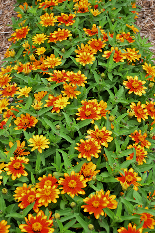 Zahara® Sunburst Zinnia will grow to be about 14 inches tall at maturity, with a spread of 14 inches. When grown in masses or used as a bedding plant, individual plants should be spaced approximately 10 inches apart. Its foliage tends to remain dense right to the ground, not requiring facer plants in front. This fast-growing annual will normally live for one full growing season, needing replacement the following year.