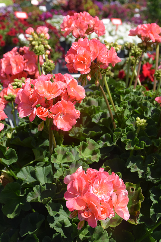 Dynamo Salmon Geranium will grow to be about 12 inches tall at maturity, with a spread of 14 inches. When grown in masses or used as a bedding plant, individual plants should be spaced approximately 12 inches apart. Its foliage tends to remain dense right to the ground, not requiring facer plants in front. Although it's not a true annual, this fast-growing plant can be expected to behave as an annual in our climate if left outdoors over the winter, usually needing replacement the following year. As such, gardeners should take into consideration that it will perform differently than it would in its native habitat.