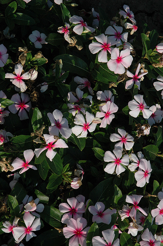 Titan™ Blush Vinca features showy shell pink star-shaped flowers with pink eyes at the ends of the stems from late spring to mid fall. Its glossy oval leaves remain dark green in color throughout the year.