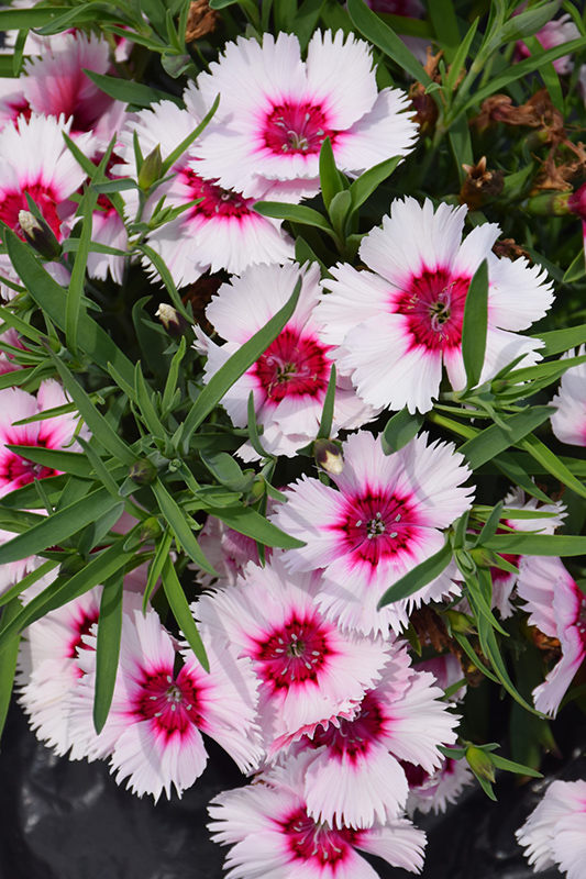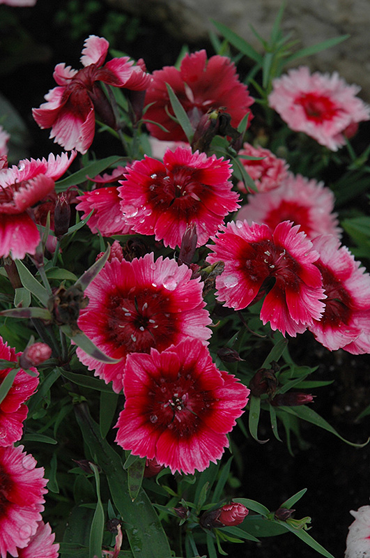 Super Parfait™ Raspberry Pinks will grow to be only 6 inches tall at maturity extending to 8 inches tall with the flowers, with a spread of 12 inches. When grown in masses or used as a bedding plant, individual plants should be spaced approximately 8 inches apart. Its foliage tends to remain low and dense right to the ground. It grows at a medium rate, and under ideal conditions can be expected to live for approximately 10 years. As an evegreen perennial, this plant will typically keep its form and foliage year-round.