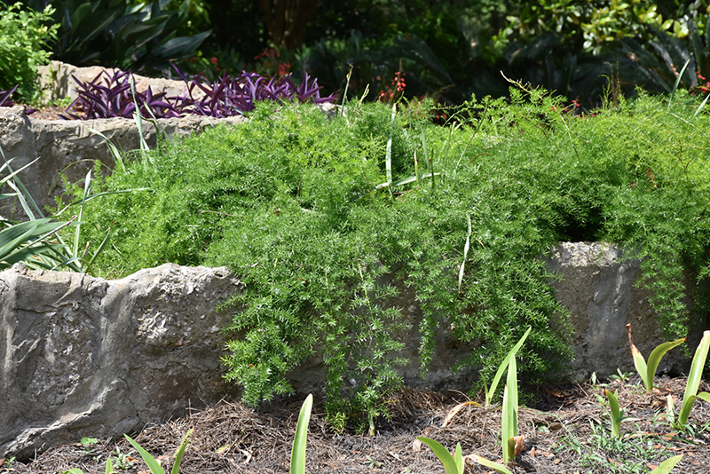 Feathery and soft, this variety of asparagus native to South Africa creates great visual interest when massed; flowers are short lived and are hidden behind foliage, therefore not very noticeable; the showy bright red berries each carry one seed
