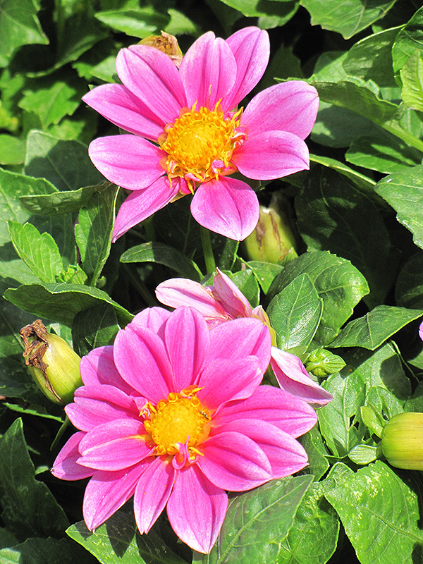 Dahlietta® Emily Dahlia features showy double pink daisy flowers with yellow eyes at the ends of the stems from early summer to mid fall. The flowers are excellent for cutting. Its serrated pointy leaves remain green in color throughout the season.