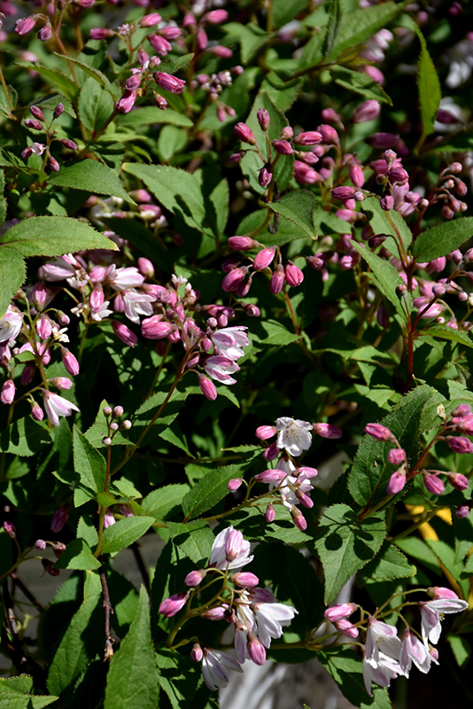 Yuki Cherry Blossom® Deutzia is covered in stunning racemes of pink cup-shaped flowers with white overtones at the ends of the branches from mid to late spring, which emerge from distinctive fuchsia flower buds. It has dark green deciduous foliage. The serrated pointy leaves turn outstanding shades of burgundy and purple in the fall.