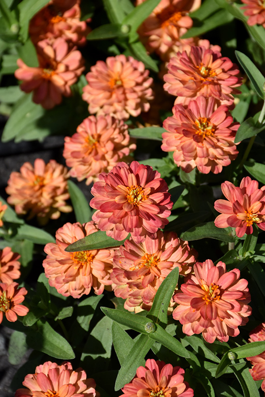 Zahara® Double Deep Salmon Zinnia features bold double salmon pincushion flowers with orange eyes at the ends of the stems from mid spring to late summer. The flowers are excellent for cutting. Its pointy leaves remain green in color throughout the season.
