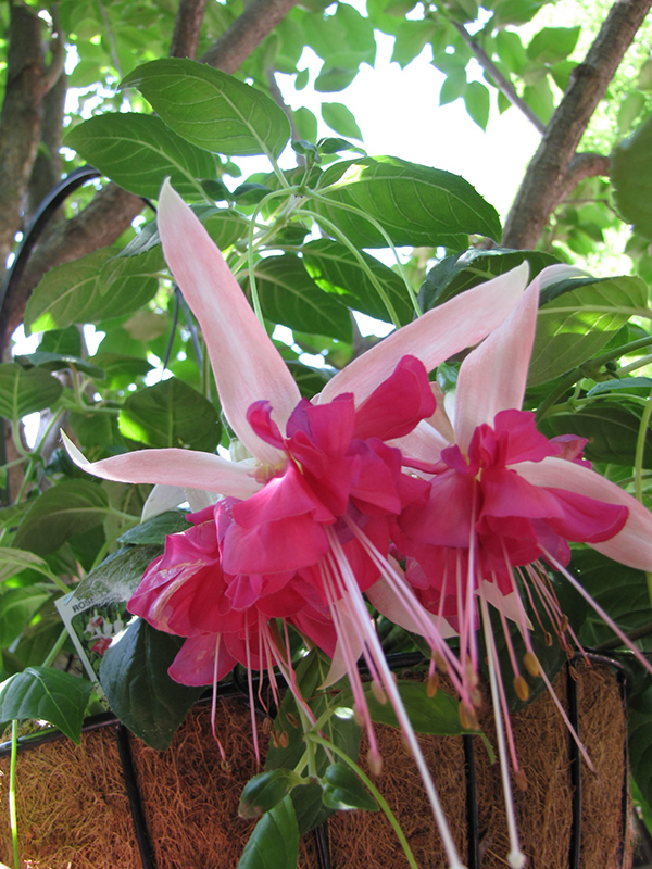 Bella Rosella Fuchsia features showy nodding double fuchsia bell-shaped flowers with shell pink overtones hanging below the branches from late spring to mid fall. Its large pointy leaves remain green in color throughout the year.