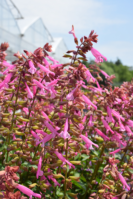 Skyscraper™ Pink Salvia has masses of beautiful spikes of pink flowers with brick red calyces rising above the foliage from late spring to mid fall, which are most effective when planted in groupings. The flowers are excellent for cutting. Its fragrant pointy leaves remain green in color throughout the season. The dark red stems can be quite attractive.