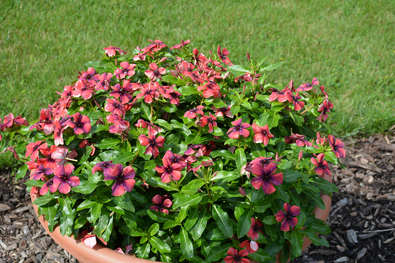 Tattoo™ Papaya Vinca is a fine choice for the garden, but it is also a good selection for planting in outdoor containers and hanging baskets. It is often used as a 'filler' in the 'spiller-thriller-filler' container combination, providing a mass of flowers against which the thriller plants stand out. Note that when growing plants in outdoor containers and baskets, they may require more frequent waterings than they would in the yard or garden.