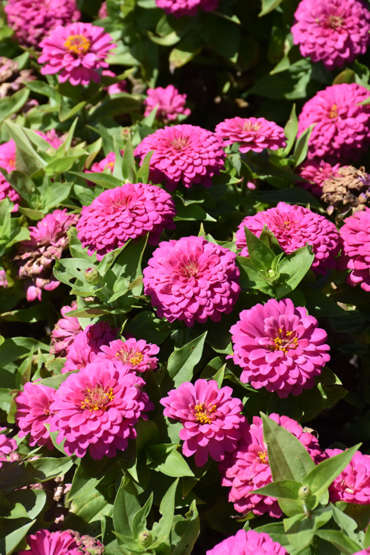 Zesty™ Pink Zinnia features bold double pink round flowers with gold eyes at the ends of the stems from late spring to early fall. The flowers are excellent for cutting. Its pointy leaves remain green in color throughout the season.