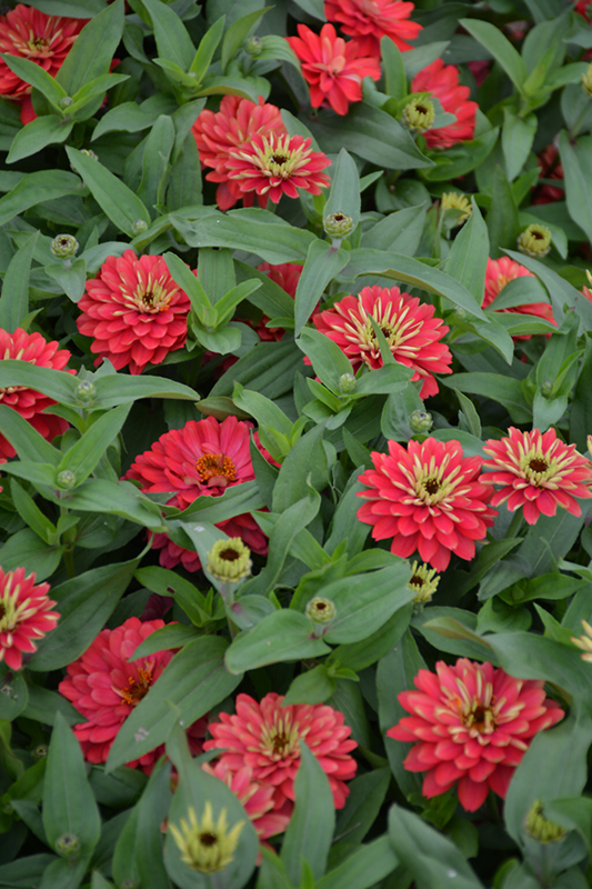 Zahara® Double Salmon Zinnia features bold double salmon pincushion flowers with dark brown eyes at the ends of the stems from mid spring to late summer. The flowers are excellent for cutting. Its pointy leaves remain green in color throughout the season.