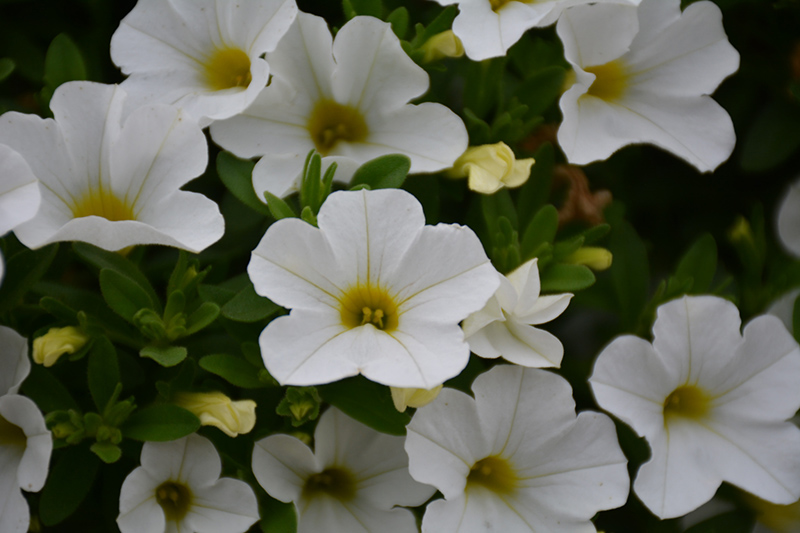 MiniFamous® Uno White Calibrachoa is draped in stunning white trumpet-shaped flowers with yellow throats at the ends of the stems from late spring to early fall. Its small pointy leaves remain green in color throughout the season.