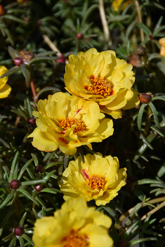 Happy Hour™ Banana Portulaca features showy double yellow frilly flowers with hot pink streaks at the ends of the stems from late spring to early fall. Its tiny succulent needle-like leaves remain green in color throughout the season.