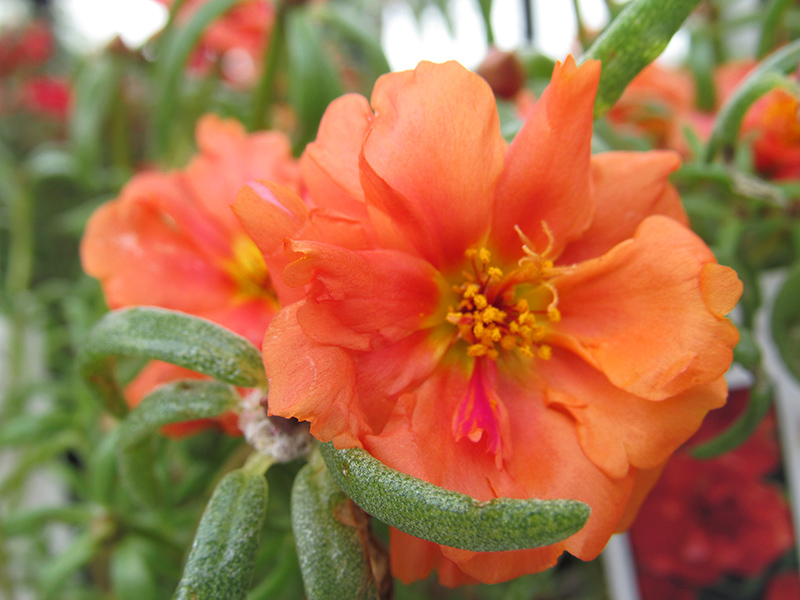 Happy Hour™ Orange Portulaca features showy double orange frilly flowers with yellow centers at the ends of the stems from late spring to early fall. Its tiny succulent needle-like leaves remain green in color throughout the season.