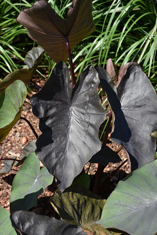 Kona Coffee Elephant Ear is primarily valued in the garden for its cascading habit of growth. Its attractive enormous glossy heart-shaped leaves emerge grayish green in spring, turning dark brown in color with hints of black throughout the season. The dark red stems can be quite attractive.