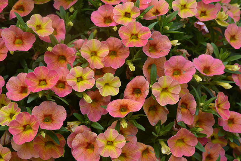 Cha-Cha™ Diva Apricot Calibrachoa is blanketed in stunning yellow trumpet-shaped flowers with peach overtones and coral-pink veins at the ends of the stems from late spring to early fall. Its small narrow leaves remain green in color throughout the season.