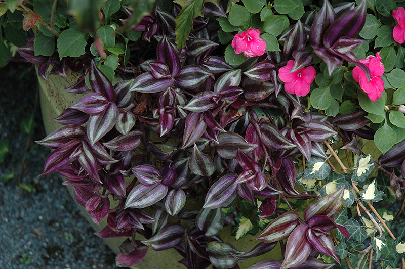 This trailing perennial is grown for its foliage; striking dark purple and burgundy leaves have silver stripes and fuchsia reverses; low maintenance, and excellent for containers or massed as groundcover