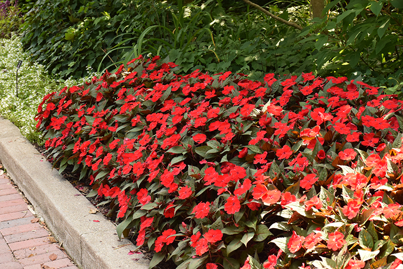 SunPatiens® Compact Deep Red Impatiens will grow to be about 26 inches tall at maturity, with a spread of 24 inches. When grown in masses or used as a bedding plant, individual plants should be spaced approximately 22 inches apart. Its foliage tends to remain dense right to the ground, not requiring facer plants in front. This fast-growing annual will normally live for one full growing season, needing replacement the following year.
