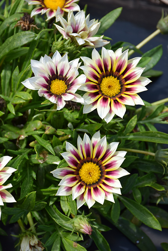 New Day® Rose Stripe Gazania features bold semi-double white daisy flowers with gold eyes and rose stripes at the ends of the stems from early summer to mid fall. The flowers are excellent for cutting. Its glossy narrow leaves remain green in color throughout the season.