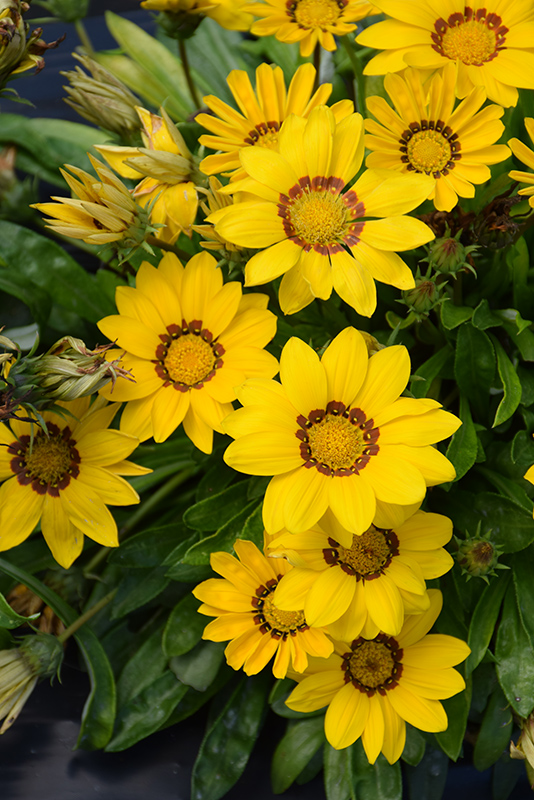 New Day® Yellow Gazania features bold semi-double yellow daisy flowers with gold eyes and a brick red ring at the ends of the stems from early summer to mid fall. The flowers are excellent for cutting. Its glossy narrow leaves remain green in color throughout the season.