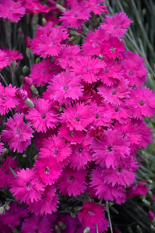 A clove scented, heat and drought tolerant series that features brightly colored frilly blooms, rising above tidy blue-green mounds of grass-like foliage; blooming from late spring throughout the summer, great for borders, containers or rock gardens