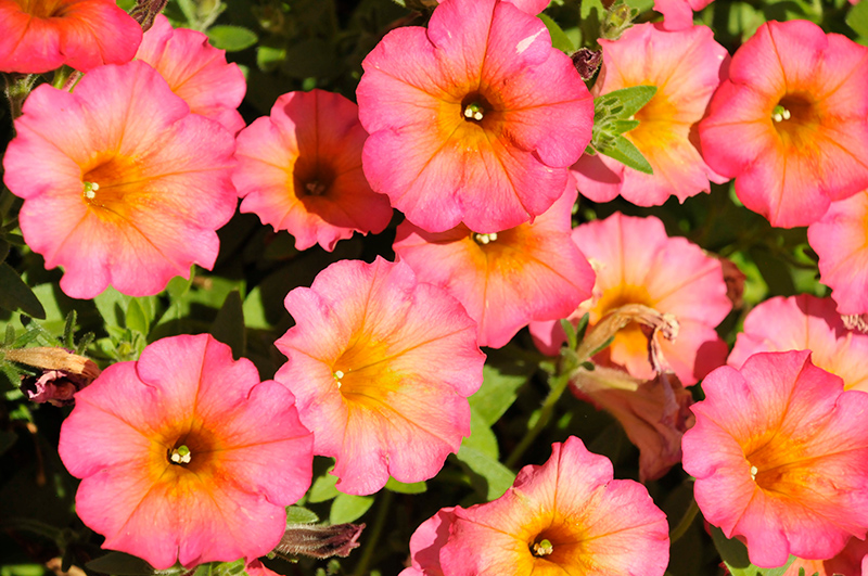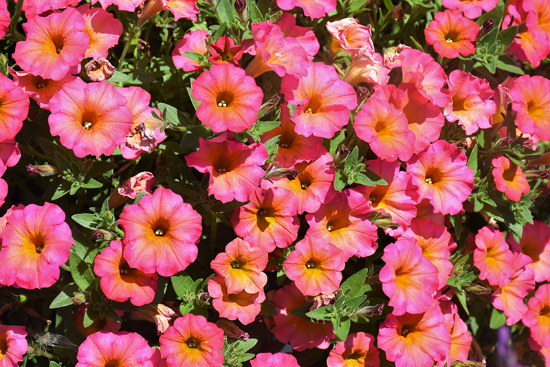Crazytunia® Mayan Sunset Petunia is covered in stunning coral-pink trumpet-shaped flowers with peach overtones and yellow throats at the ends of the stems from mid spring to late summer. Its pointy leaves remain green in color throughout the season.