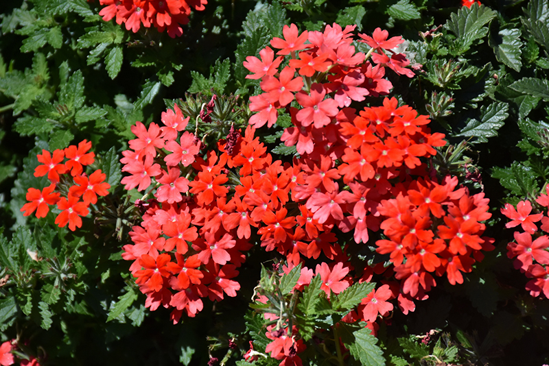 Lascar™ Orange Lava Verbena features showy clusters of orange star-shaped flowers with scarlet overtones and creamy white eyes at the ends of the stems from late spring to mid fall. The flowers are excellent for cutting. Its small tomentose narrow leaves remain green in color throughout the season.