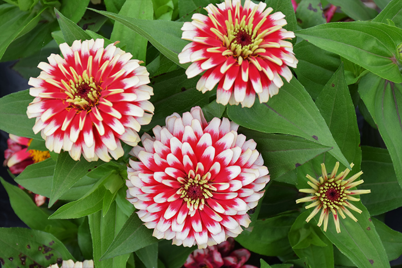 Swizzle™ Cherry and Ivory Zinnia features bold fully double cherry red daisy flowers with creamy white tips at the ends of the stems from mid spring to late summer. The flowers are excellent for cutting. Its pointy leaves remain green in color throughout the season.