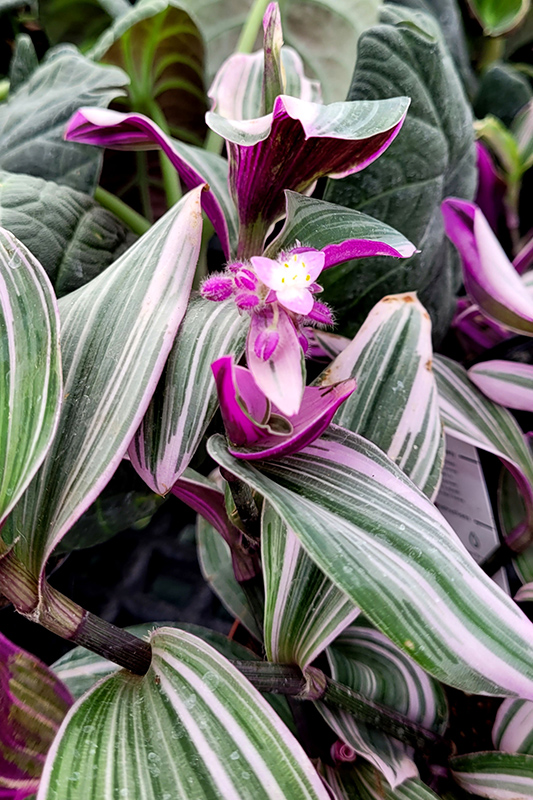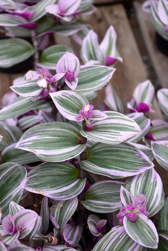 This trailing tropical is grown for its foliage; emerging purple leaves mature to green, with white stripes and violet reverses; low maintenance, and excellent for beds, border fronts, hanging baskets and patio containers