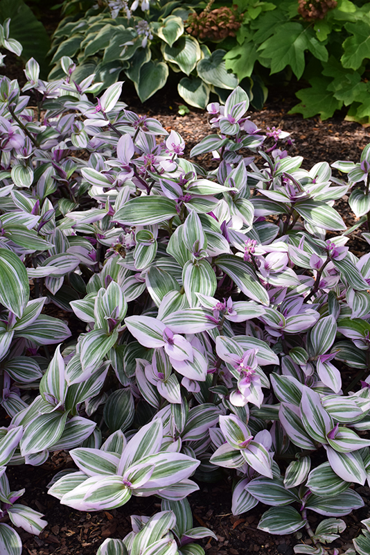 Nanouk Tradescantia will grow to be about 14 inches tall at maturity, with a spread of 14 inches. When grown in masses or used as a bedding plant, individual plants should be spaced approximately 10 inches apart. Its foliage tends to remain dense right to the ground, not requiring facer plants in front. Although it's not a true annual, this fast-growing plant can be expected to behave as an annual in our climate if left outdoors over the winter, usually needing replacement the following year. As such, gardeners should take into consideration that it will perform differently than it would in its native habitat. As this plant tends to go dormant in summer, it is best interplanted with late-season bloomers to hide the dying foliage.