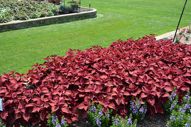 Add some flare to gardens and containers with this stunning coleus; beautiful ruby red foliage with crinkled margins creating a lovely accent; this selection is ideal for adding a pop of color all season long; well branched and low maintenance